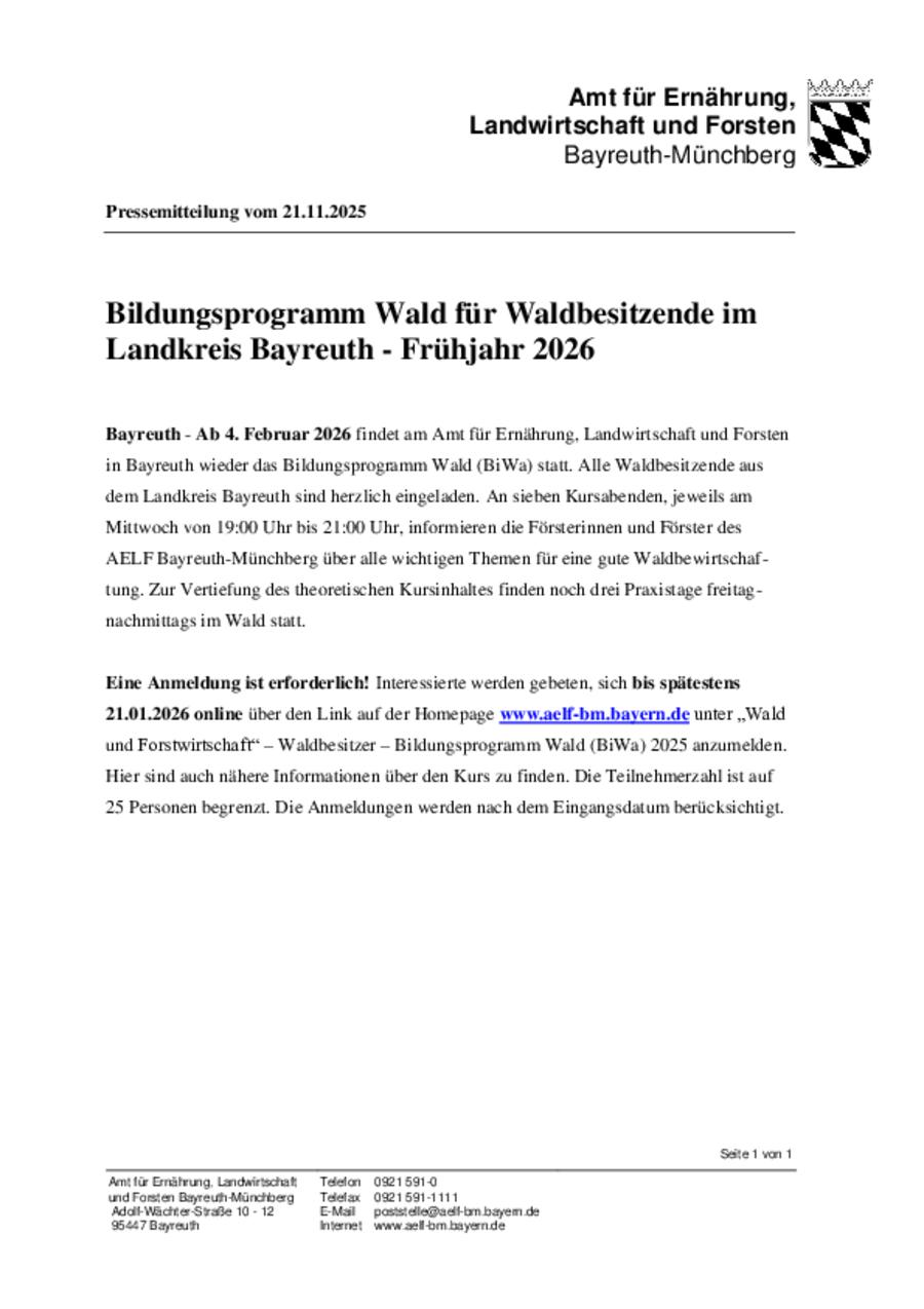 Eine Anmeldung ist erforderlich! Interessierte werden gebeten, sich bis spätestens 21.01.2026 online über den Link auf der Homepage www.aelf-bm.bayern.de unter „Wald und Forstwirtschaft“ – Waldbesitzer – Bildungsprogramm Wald (BiWa) 2025 anzumelden. Hier sind auch nähere Informationen über den Kurs zu finden. Die Teilnehmerzahl ist auf 25 Personen begrenzt. Die Anmeldungen werden nach dem Eingangsdatum berücksichtigt.