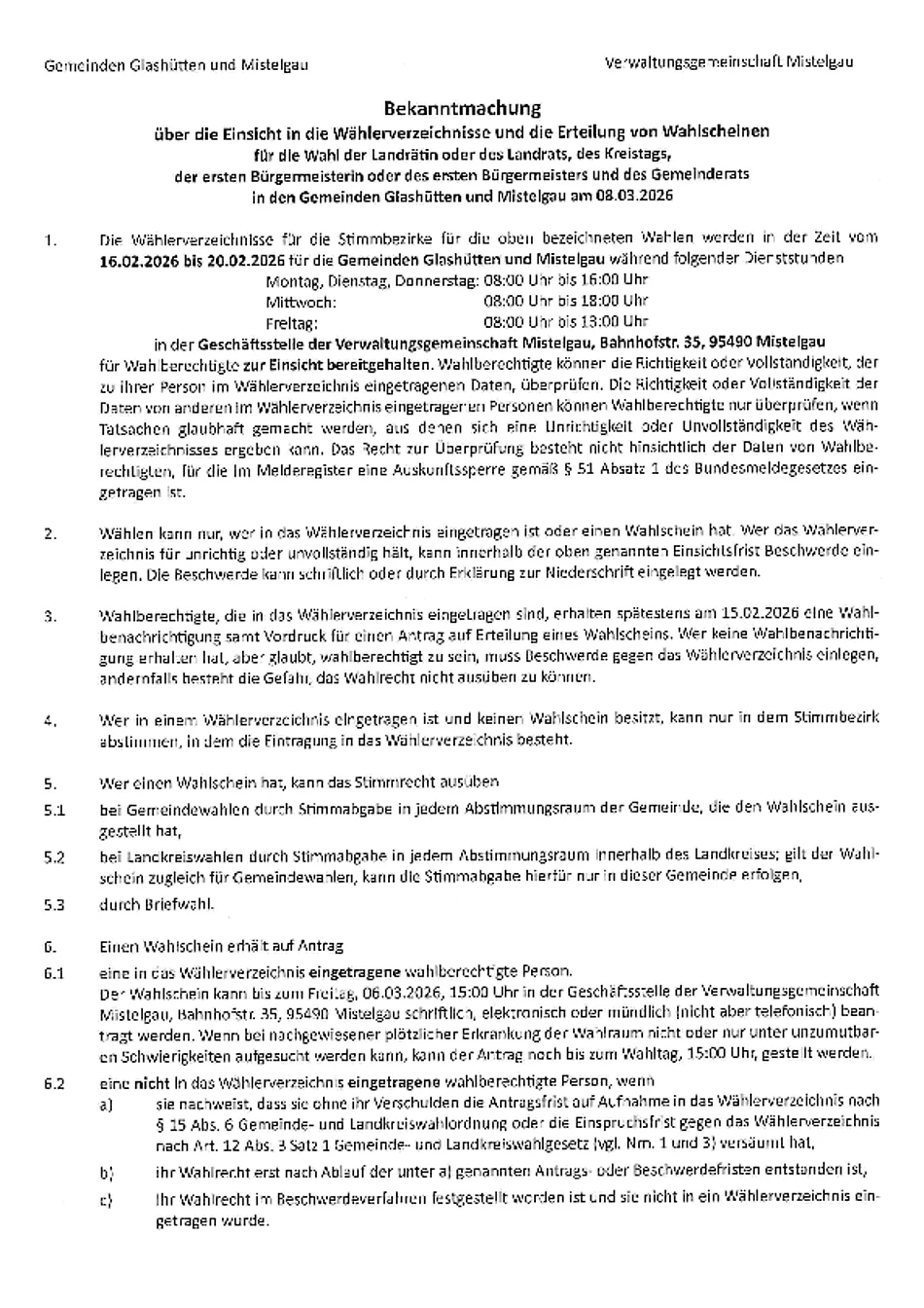 1.            Die Wählerverzeichnisse für die Stimmbezirke für die oben bezeichneten Wahlen werden in der Zeit vom 16.02.2026 bis 20.02.2026 für die Gemeinden Glashütten und Mistelgau während folgender Dienststunden