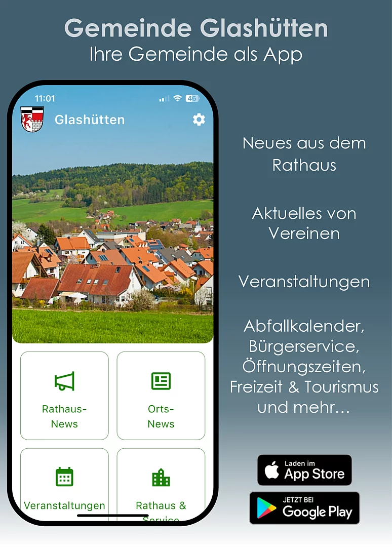 Wir freuen uns darauf, Sie auf unseren neuen App`s der Gemeinde Glashütten begrüßen zu dürfen.