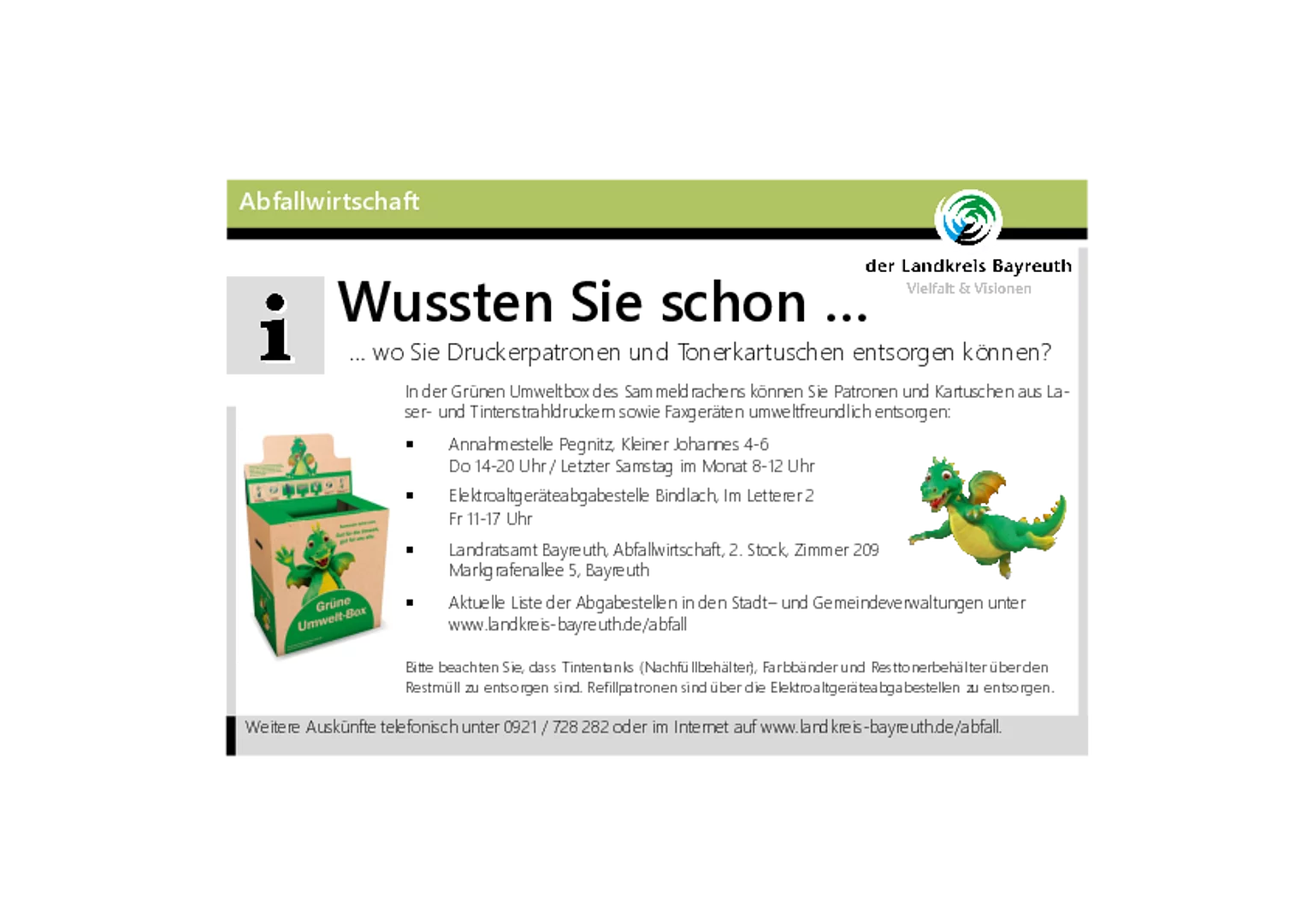 In der Grünen Umweltbox des Sammeldrachens können Sie Patronen und Kartuschen aus La-ser- und Tintenstrahldruckern sowie Faxgeräten umweltfreundlich entsorgen: