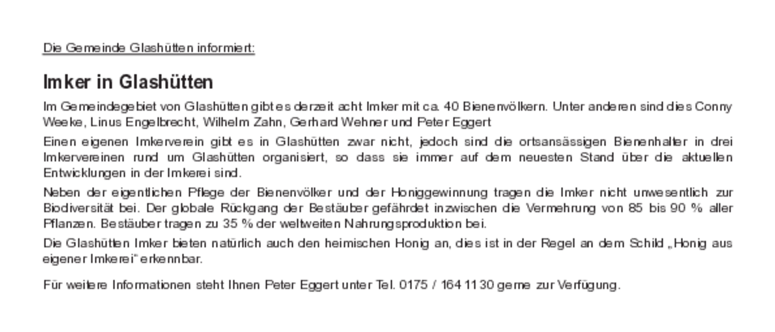 Im Gemeindegebiet von Glashütten gibt es derzeit acht Imker mit ca. 40 Bienenvölkern. Unter anderen sind dies Conny