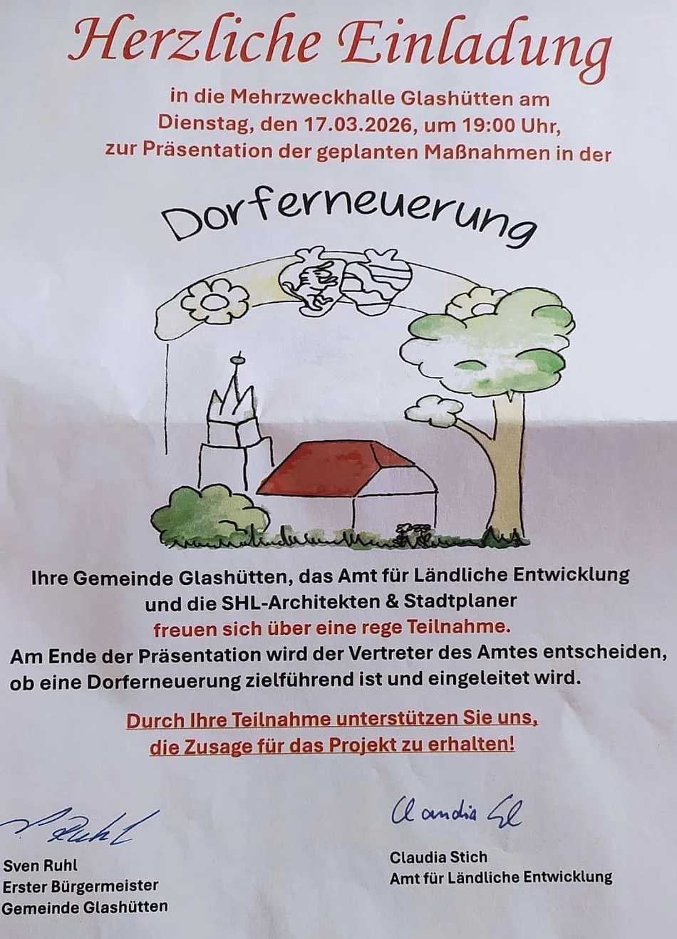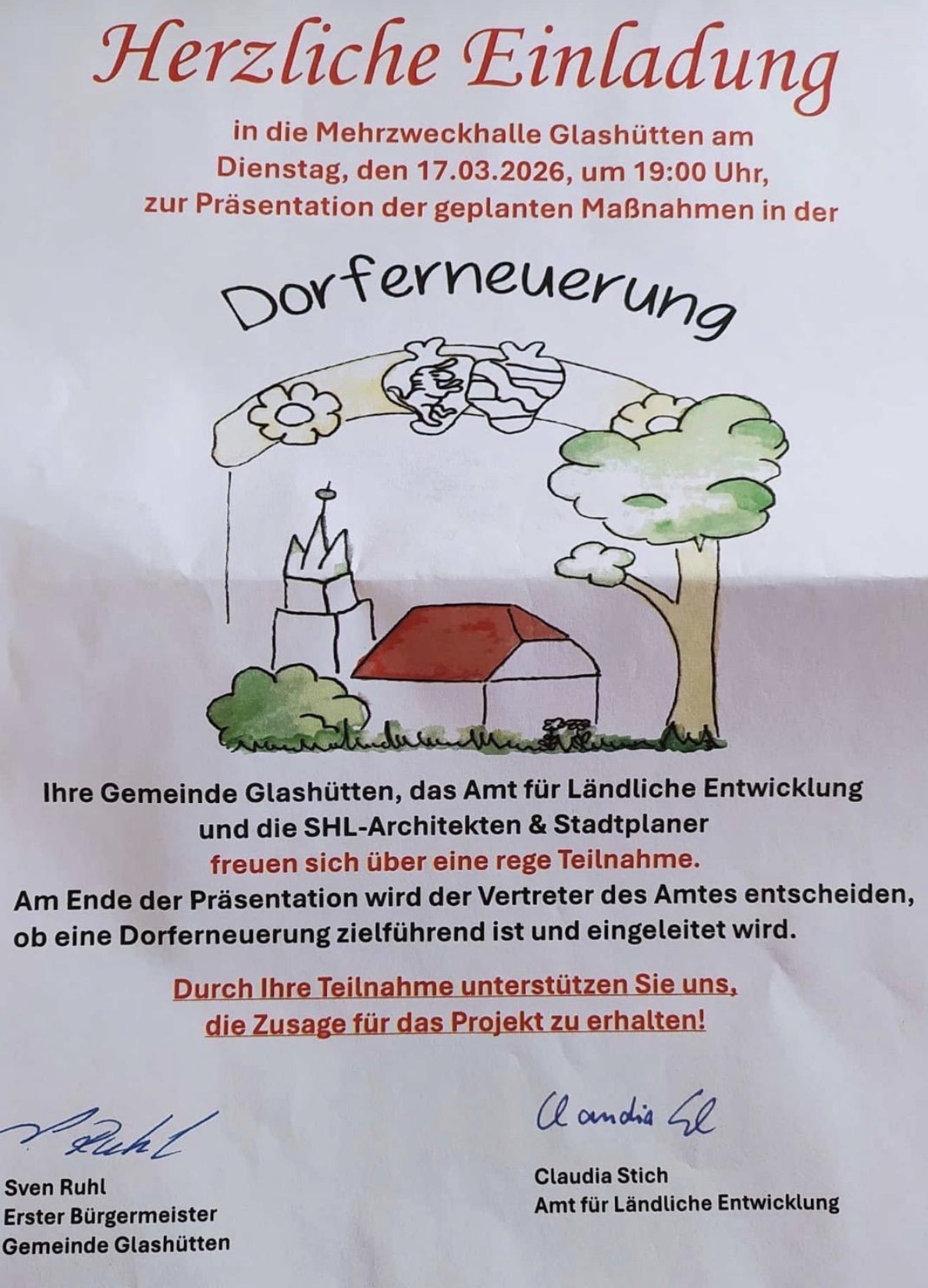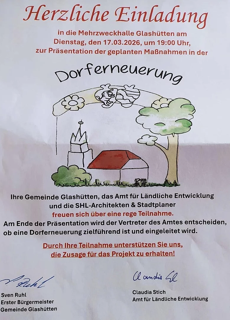 Ihre Gemeinde Glashütten, das Amt für Ländliche Entwicklung und die SHL-Architekten & Stadtplaner freuen sich über eine rege Teilnahme.