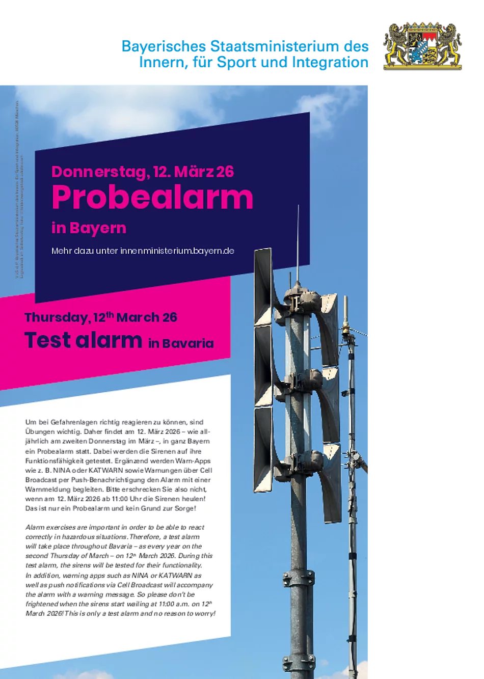 Am 12. März 2026 findet der jährliche landesweit einheitliche Probealarm in Bayern statt.