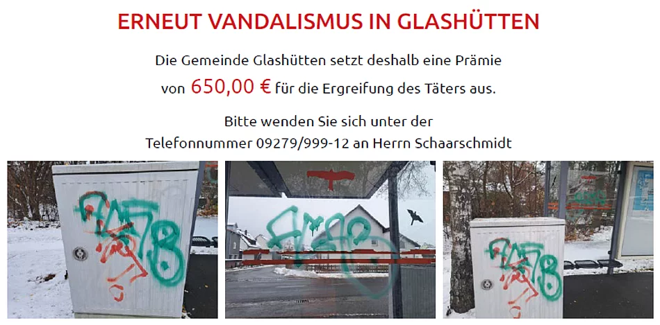 DIE GEMEINDE GLASHÜTTEN SETZT EINE PRÄMIE VON 650,00 € FÜR DIE ERGREIFUNG DES TÄTERS AUS.